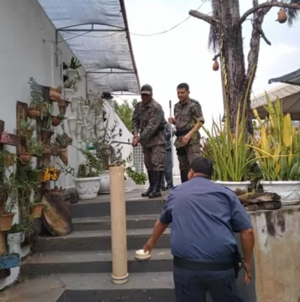O animal ficou dormindo até a chegada dos policiais. “Você sai de manhã, com um cafezinho na mão e tirando os matinhos com a mão. Vai vendo aqui. Eu enfiei a mão dentro desse vasinho aqui”, disse ela, em um vídeo que compartilhou em redes sociais, sobre como encontrou a cobra.
