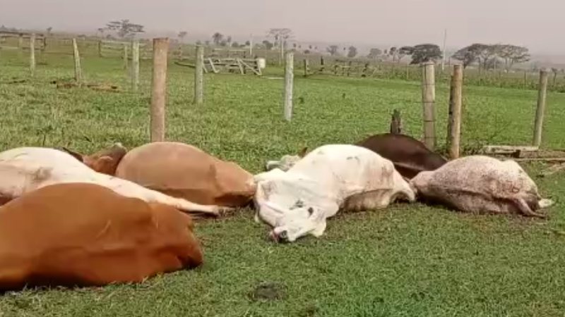 A tempestade deste fim de semana resultou na morte de 49 bois e dois cavalos eletrocutados em uma propriedade rural em Eldorado, cidade a 442 km de Campo Grande, na tarde do último sábado (23). De acordo com a veradora Daiane Lacerda, que é filha do proprietário da fazendo Ilha Grande, o incidente ocorreu após o vendaval derrubar um fio energizado numa cerca próximo de onde estavam os animais, o que ocasionou as mortes.