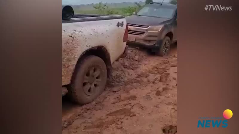Em imagens feitas por moradores, é possível ver uma caminhonete atolada na estrada tomada por lama. O veículo só consegue sair depois de ser guinchado por uma caminhonete maior e mais potente.