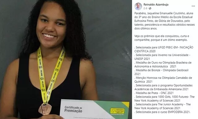 A estudante Jaqueline Emanuele Coutinho Siebra, 17 anos, é famosa entre os moradores de Glória de Dourados, a 281 km de Campo Grande, devido ao seu esforço e dedicação nos estudos. A fama da jovem não ficou só no município e chegou aos ouvidos do governador do Estado, Reinaldo Azambuja (PSDB), que a elogiou publicamente nas redes sociais.