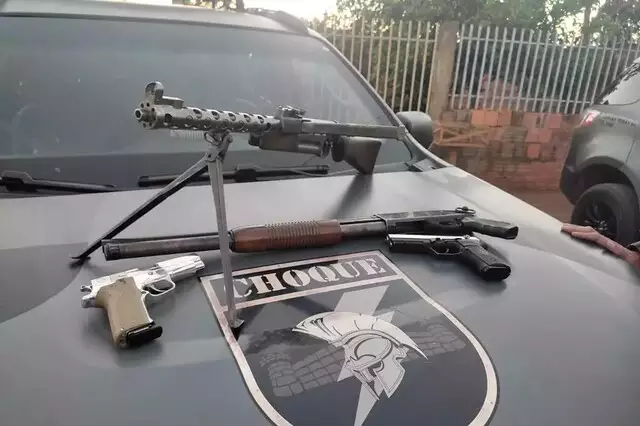 Durante buscas na residência, foi encontrado em um dos quartos, embaixo da cama, escondido em um lençol, três armas, sendo 1 submetralhadora calibre 9mm; 1 escopeta calibre 12; 1 pistola 9mm, além da pistola calibre 9mm que estava com o autor do crime, carregada com sete munições.