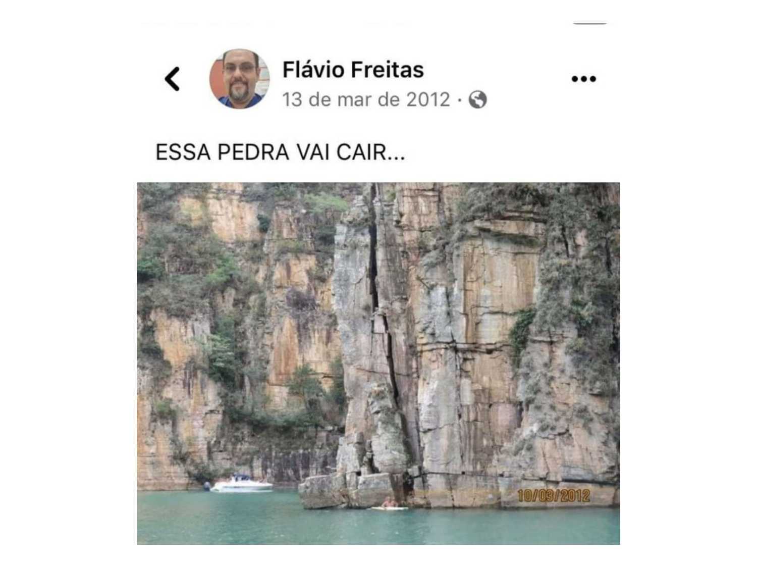 O registro feito pelo médico Flávio Freitas há dez anos mostra uma lancha e banhistas próximo a uma fenda na pedra. “Essa pedra vai cair”, escreveu Freitas. Até as 10h30 deste domingo (9), a publicação contava com 93 mil compartilhamentos. “Demorou… Mas um dia cumpriu seu destino. Uma pena que foi na hora errada para algumas pessoas”, escreveu uma pessoa no post. ” Infelizmente aconteceu, caiu”, disse outra.