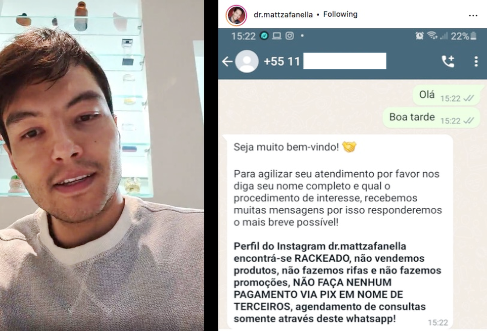 “Pessoal, meu perfil @dr.mattzafanella foi hackeado. Vocês que me seguem, estão vendo algumas promoções e divulgações de videogame, geladeira, sorteios e rifas. Não somos nós, não sou eu. Fiquem atentos, trata-se de uma quadrilha muito bem especializada, que além de terem hackeado meu Instagram, hackearam o What’sApp, o número de telefone, e-mail, Facebook, a maquininha da clínica. Tentaram até invadir conta de banco”, afirmou o dentista.