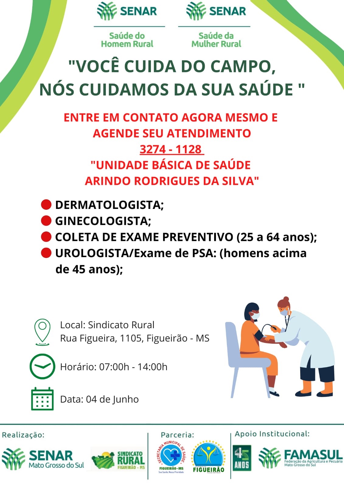 Atendendo reivindicação do presidente do Sindicato Rural de Figueirão, Antonio Azevedo Nabhan, o Senar/MS (Serviço Nacional de Aprendizagem Rural) fará realizar no dia 04 de junho, mais uma edição do Programa Saúde do Homem e da Mulher Rural em Figueirão.