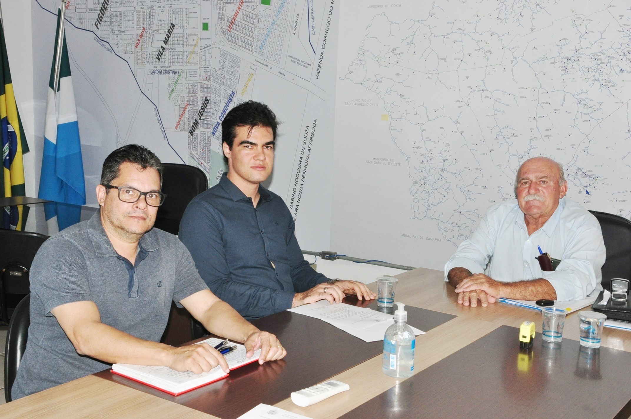 ASSECOM/PMFigueirão – Foto: Delegado André Peres Stafusa (no centro, de camisa azul), prefeito Juvenal e secretário de gestão Francisco Junior, reunidos no Gabinete – Rubem Vasconcellos/PMF