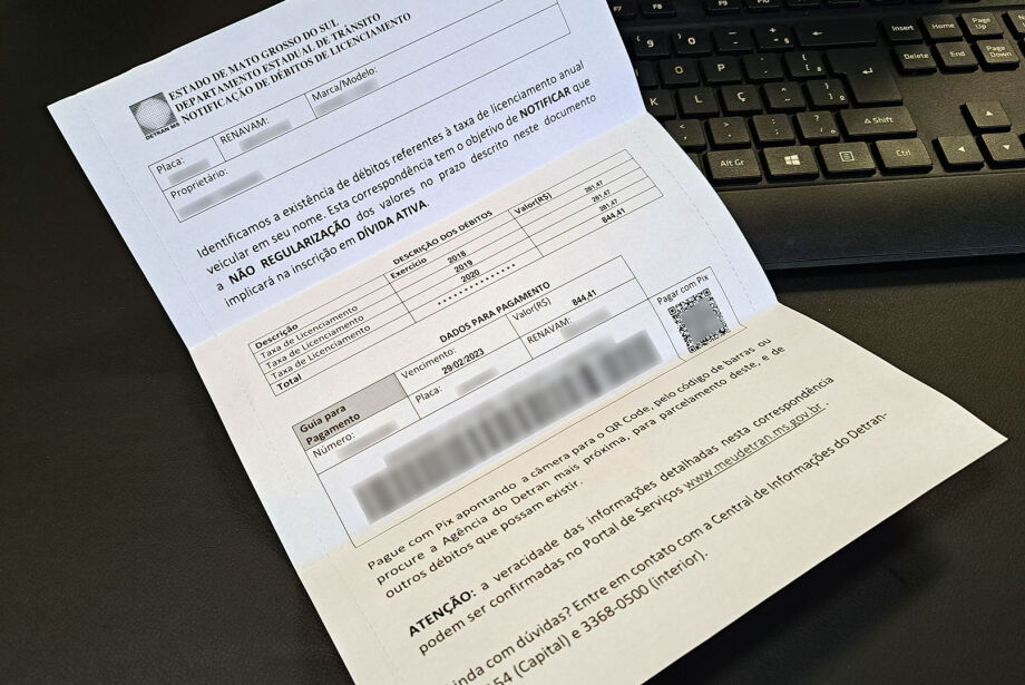 Nas correspondências que os proprietários estão recebendo constam as informações do veículo, do proprietário e a descrição das dívidas existentes, com código de barras ou QR code para pagamento. O prazo para pagamento é 29 de fevereiro.