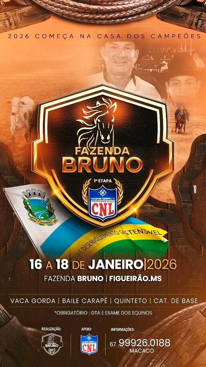 O evento acontece de 16 a 18 de janeiro, na Fazenda Bruno, localizada a 10 km de Figueirão, sentido Alcinópolis, na rodovia MS-223, consolidando o local como um dos principais pontos de encontro dos laçadores do Estado.