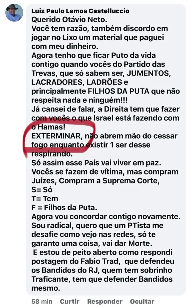 “Você tem razão, também discordo em jogar no Lixo um material que paguei com meu dinheiro. Agora tenho que ficar Puto da vida contigo quando vocês do Partido das Trevas, que só sabem ser, JUMENTOS, LACRADORES, LADRÕES e principalmente FILHOS DA PUTA que não respeita nada e ninguém!!! Já cansei de falar, a Direita tem que fazer com vocês o que Israel está fazendo com o Hamas! EXTERMINAR, não abrem mão do cessar fogo enquanto existir 1 ser desse respirando. Só assim esse País vai viver em paz. Vocês se fazem de vítima, mas compram Juízes, Compram a Suprema Corte”, comentou.