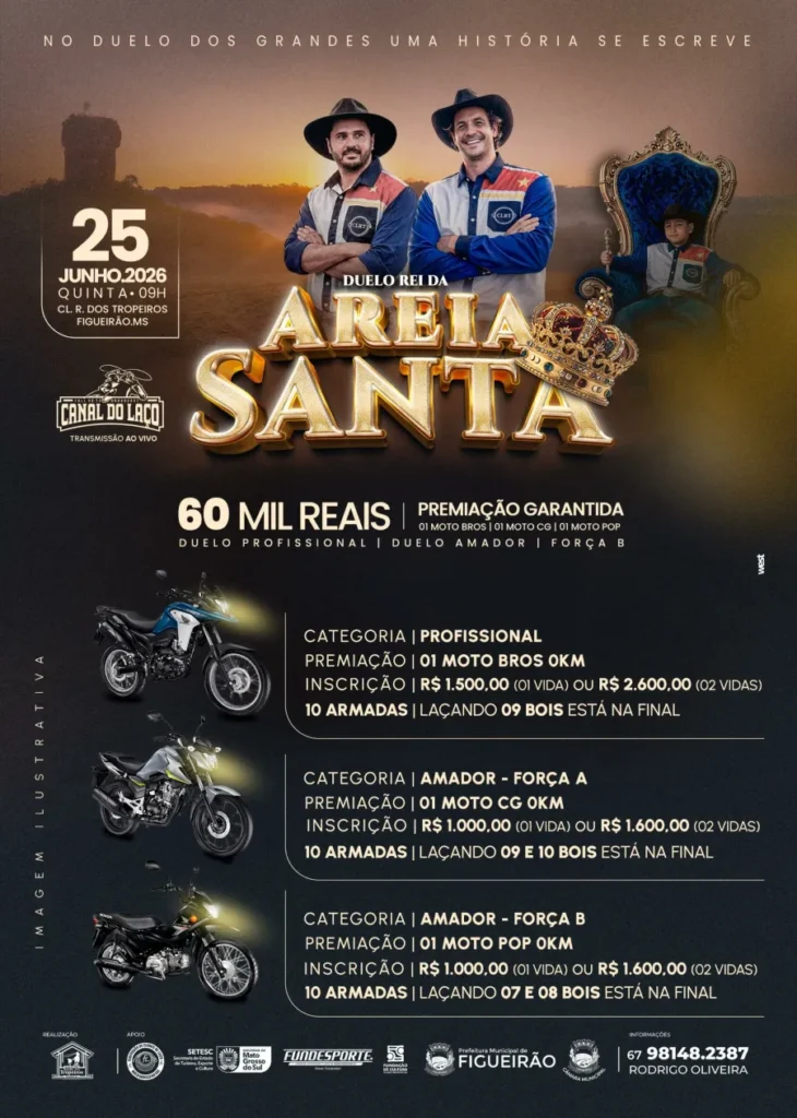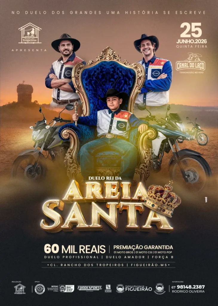 A abertura oficial acontece na quinta-feira (25), a partir das 9h, no Clube do Laço Rancho dos Tropeiros, com o tradicional Duelo Rei da Areia Santa, que terá premiação garantida de R$ 60 mil, incluindo três motos 0 km: uma Bros, uma CG e uma Pop.