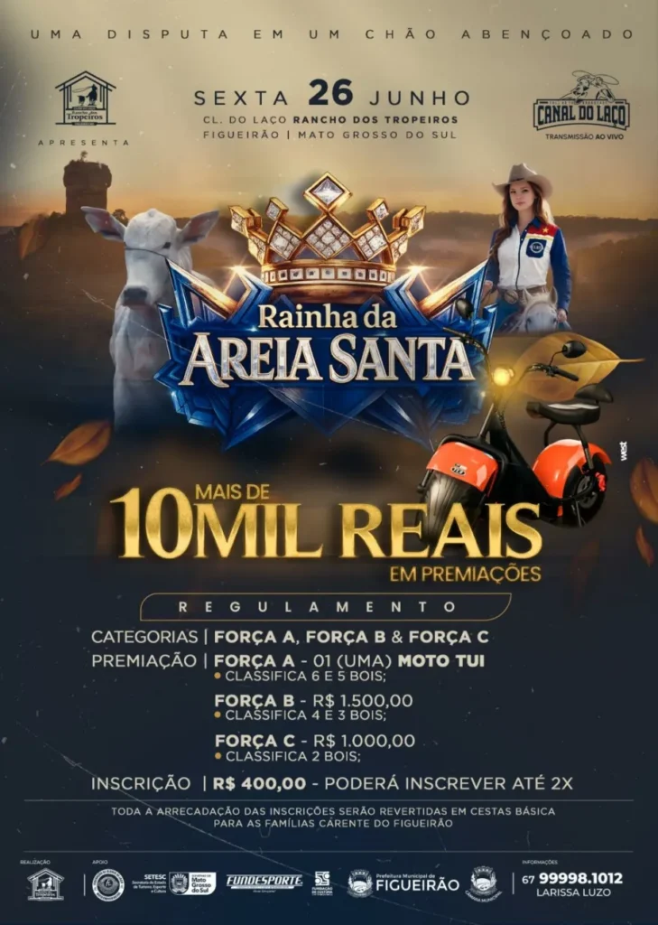 O evento também contará com o Duelo Feminino Rainha da Areia Santa, na sexta-feira (26), com mais de R$ 10 mil em premiações. Toda a arrecadação das inscrições será revertida em cestas básicas para famílias em situação de vulnerabilidade em Figueirão.